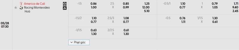 Bảng Tỷ lệ kèo bóng đá América de Cali vs Racing de Montevideo