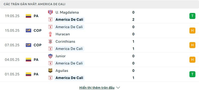 5 trận gần nhất của América de Cali: W-D-D-D-W