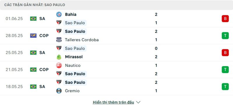 5 trận gần nhất của São Paulo: L-W-L-W-W