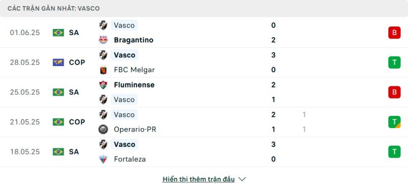 Thống kê phong độ gần đây São Paulo vs Vasco da Gama