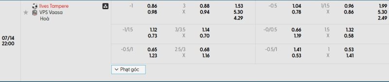 Bảng Tỷ lệ kèo bóng đá Ilves vs VPS