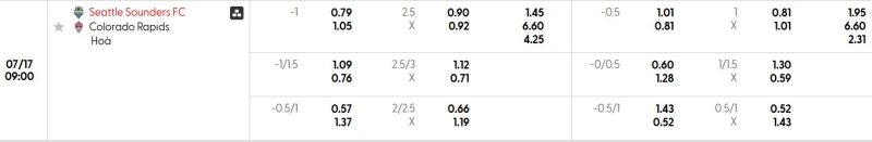 Bảng Tỷ lệ kèo bóng đá Seattle Sounders FC vs Colorado Rapids