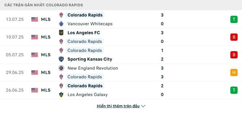 5 trận gần nhất của Colorado Rapids: W-L-L-D-W