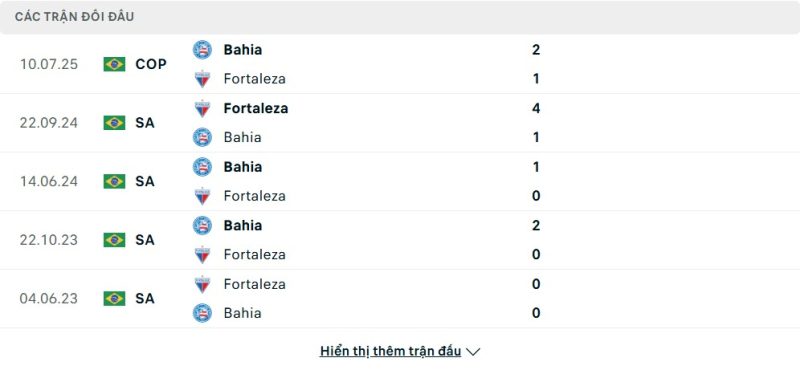 Thống kê phong độ gần đây Fortaleza vs Bahia