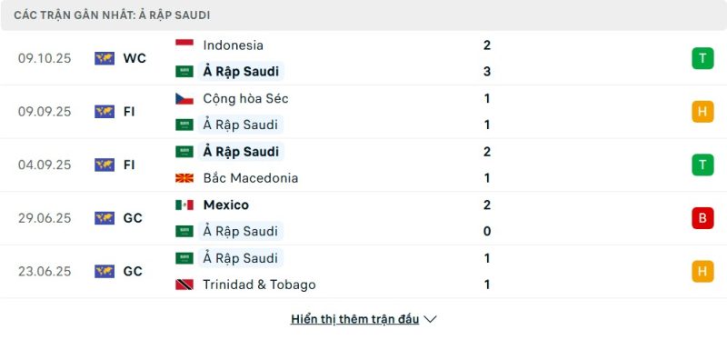 5 trận gần nhất của Ả Rập Xê Út: W-D-W-L-D