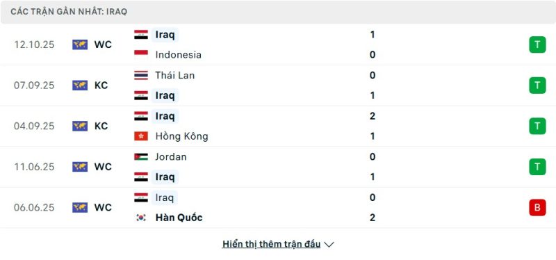 5 trận gần nhất của Iraq: W-W-W-W-L