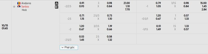 Bảng Tỷ lệ kèo bóng đá Andorra vs Serbia