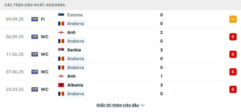 5 trận gần nhất của Andorra: D-L-L-L-L