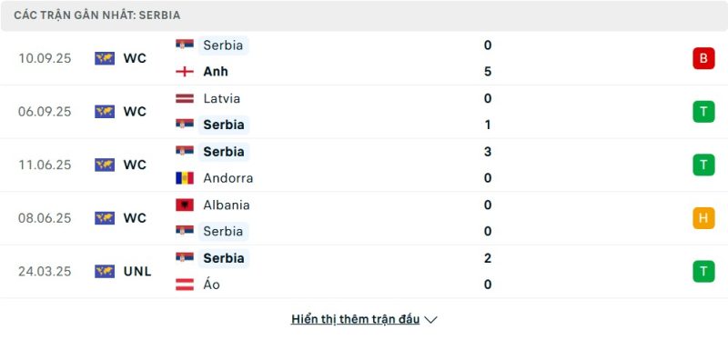 5 trận gần nhất của Serbia: L-W-W-D-W