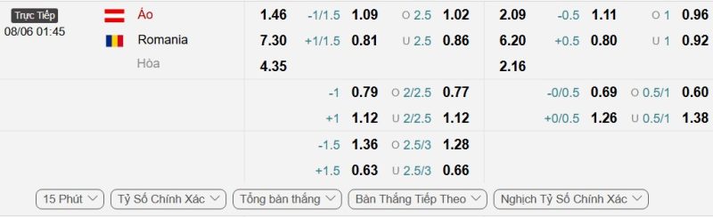 - Kèo tỷ số bóng đá hiệp 1: Áo 0-0 Romania