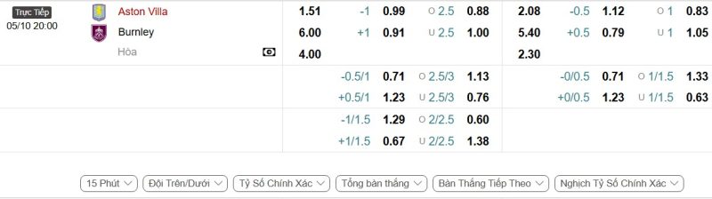 Bảng Tỷ lệ kèo bóng đá Aston Villa vs Burnley