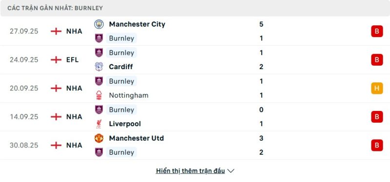 Burnley đang trải qua mùa giải khó khăn khi xếp thứ 18 trên bảng xếp hạng Premier League. Họ thắng 1, hòa 1 và thua 4 trong 6 vòng đấu đầu tiên. Trong các trận gần đây, đội bóng thắng 2-0 trước Sunderland nhưng lại thua 1-5 trước Man City và 0-1 trước Liverpool, thể hiện sự bất ổn lớn trong thi đấu. Burnley cũng thất bại 1-2 trước Cardiff ở EFL Cup, cho thấy khả năng phòng ngự và triển khai tấn công chưa hiệu quả. Lối chơi phụ thuộc nhiều vào phản công và những tình huống cố định, khiến Burnley gặp khó trước các đối thủ áp sát nhanh và kiểm soát bóng tốt.