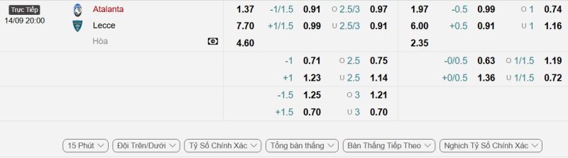Bảng Tỷ lệ kèo bóng đá Atalanta vs Lecce