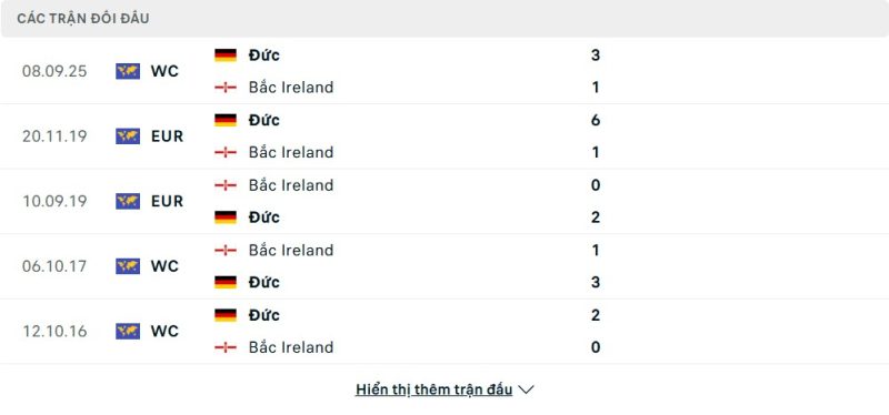 Thành tích đối đầu của Bắc Ireland vs Đức