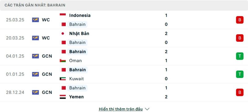 5 trận gần nhất của Bahrain: L-L-W-W-L