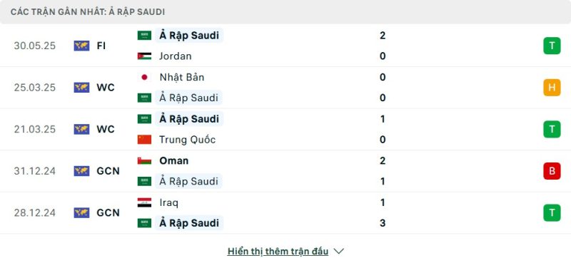 5 trận gần nhất của Ả Rập Xê Út: W-D-W-L-W