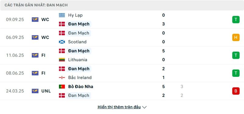 5 trận gần nhất của Đan Mạch: W-D-W-W-L