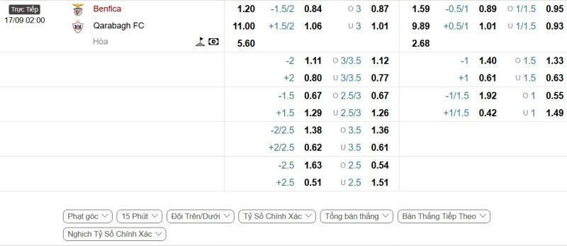Bảng Tỷ lệ kèo bóng đá Benfica vs Qarabağ