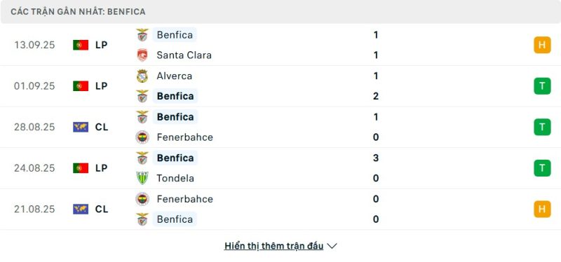 5 trận gần nhất của Benfica: D-W-W-W-D