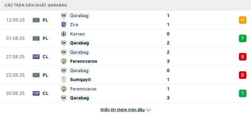 5 trận gần nhất của Qarabağ: D-W-L-L-W