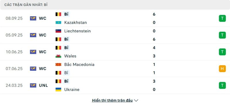 5 trận gần nhất của Bỉ: W-W-W-D-W