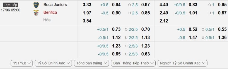 Bảng Tỷ lệ kèo bóng đá Boca Juniors vs Benfica