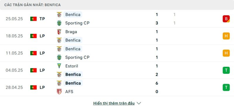 5 trận gần nhất của Benfica: D-D-D-W-W