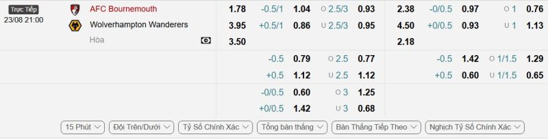 - Kèo tỷ số bóng đá hiệp 1: Bournemouth 2-0 Wolverhampton Wanderers