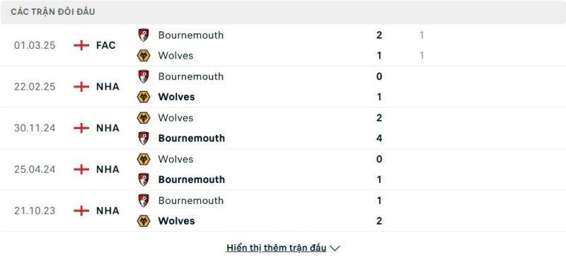 Thành tích đối đầu của Bournemouth vs Wolverhampton Wanderers