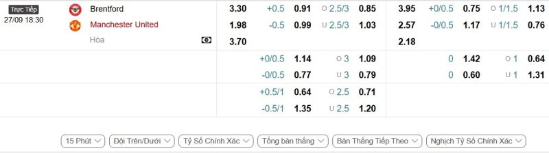 - Kèo tỷ số bóng đá hiệp 1: Brentford 1-1 Manchester United