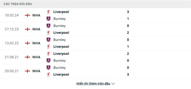 Thống kê phong độ gần đây Burnley vs Liverpool