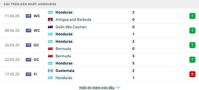 5 trận gần nhất của Honduras: W-W-W-W-L