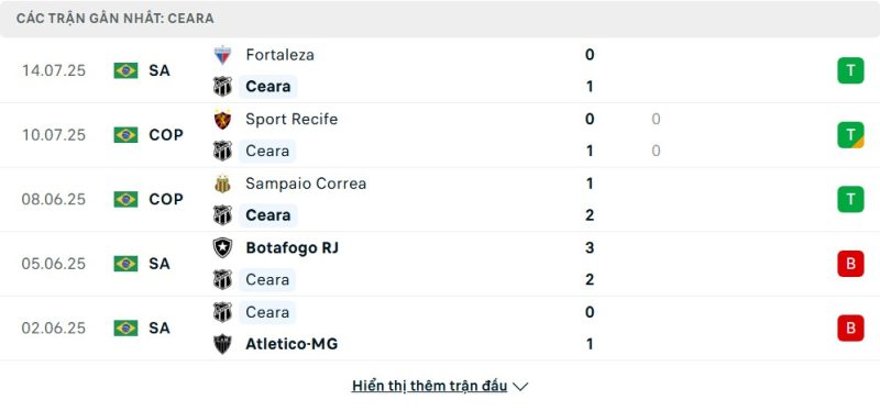 Thống kê phong độ gần đây Ceará vs Corinthians