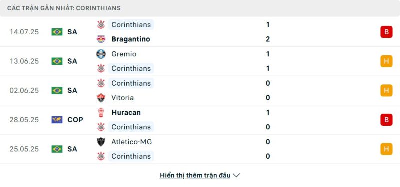 5 trận gần nhất của Corinthians: L-D-D-L-D