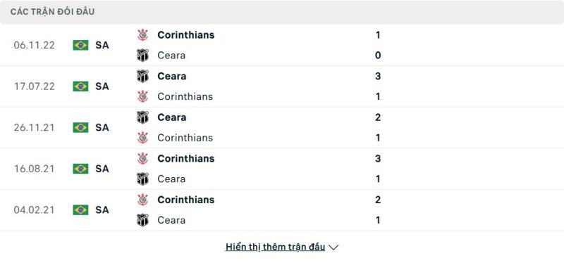 Thành tích đối đầu của Ceará vs Corinthians