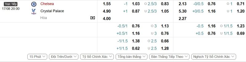 Bảng Tỷ lệ kèo bóng đá Chelsea vs Crystal Palace