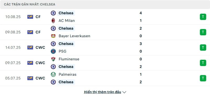 5 trận gần nhất của Chelsea: W-W-W-W-W
