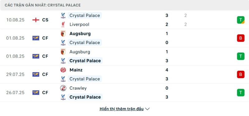 Bên kia chiến tuyến, Crystal Palace cũng vừa tạo dấu ấn khi giành chiến thắng trước Liverpool để đoạt Community Shield. Tuy nhiên, phong độ tổng thể ở giai đoạn chuẩn bị chưa thực sự ổn định, khi xen kẽ giữa những chiến thắng trước Millwall và Crawley là các thất bại trước Augsburg hay Mainz. Dù vậy, Palace vẫn cho thấy khả năng gây bất ngờ nhờ lối chơi kỷ luật và những cá nhân có thể tạo đột biến ở tuyến trên.