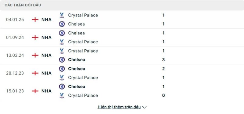 Thành tích đối đầu của Chelsea vs Crystal Palace