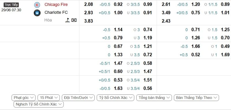 - Kèo tỷ số bóng đá hiệp 1: Chicago Fire 1-0 Charlotte FC