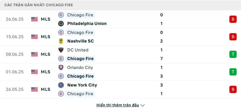 5 trận gần nhất của Chicago Fire: L-L-W-W-L