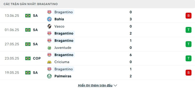 Bên kia chiến tuyến, Red Bull Bragantino cho thấy sự ổn định tương đối về mặt kết quả. Sau hai chiến thắng liên tiếp trước Vasco da Gama và Juventude, họ bất ngờ nhận thất bại nặng nề 0–3 trước Bahia ở vòng đấu gần nhất. Tuy nhiên, lối chơi kiểm soát bóng chặt chẽ và tấn công biên vẫn được HLV Fernando Seabra duy trì. Với Gabriel và Eric Ramires ở tuyến giữa, Bragantino vẫn là một đội bóng có khả năng xoay chuyển thế trận nếu kiểm soát được nhịp độ. Dù mới trắng tay, họ vẫn duy trì vị trí khá tốt trên bảng xếp hạng.