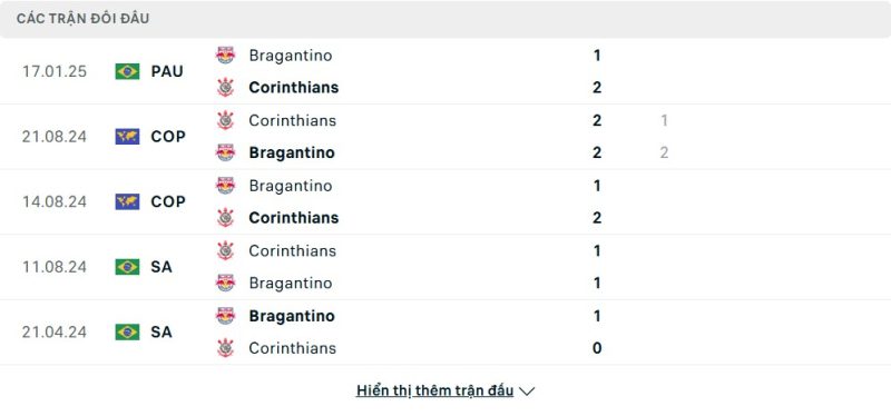 Thành tích đối đầu của Corinthians vs Red Bull Bragantino