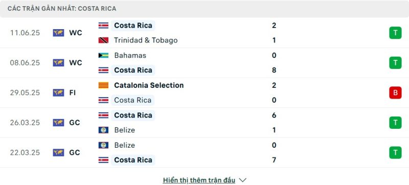 5 trận gần nhất của Costa Rica: W-W-L-W-W