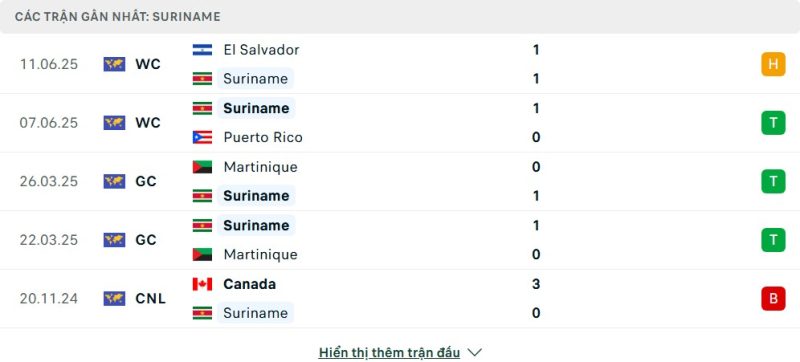 5 trận gần nhất của Suriname: D-W-W-W-L