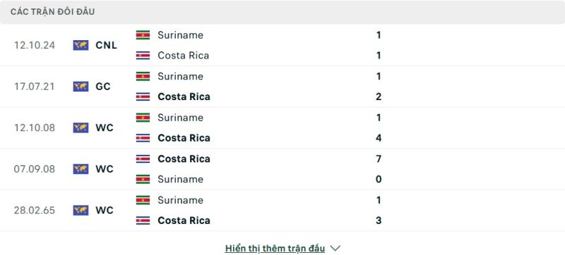 Thành tích đối đầu của Costa Rica vs Suriname