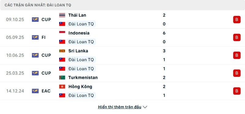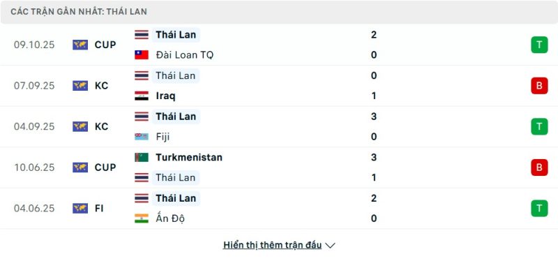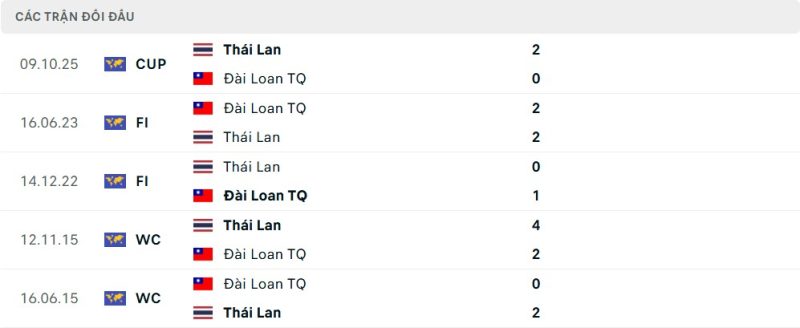 Thống kê phong độ gần đây Đài Bắc Trung Hoa vs Thái Lan