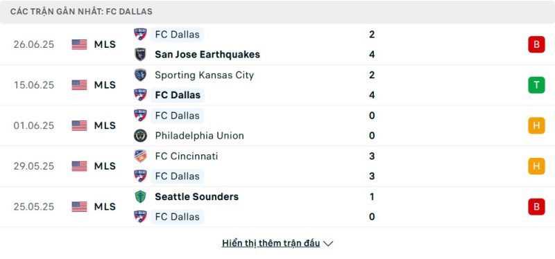 5 trận gần nhất của FC Dallas: L-W-D-D-L
