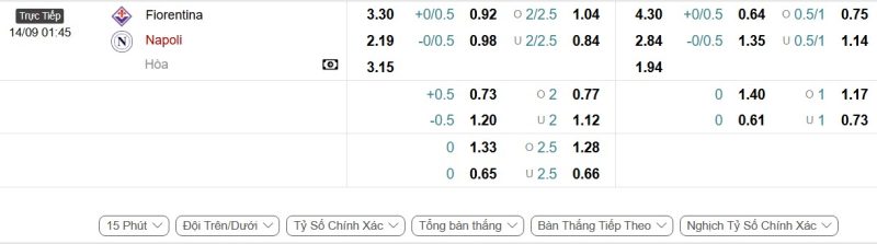 Bảng Tỷ lệ kèo bóng đá Fiorentina vs Napoli