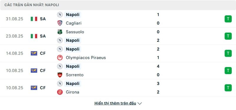 Napoli lại cho thấy sự khởi đầu ấn tượng với hai chiến thắng liên tiếp tại Serie A, lần lượt vượt qua Sassuolo và Cagliari mà không để thủng lưới. Nhờ đó, họ đang chia sẻ ngôi đầu bảng cùng Juventus với hiệu số bàn thắng bại khá tích cực. Đáng chú ý, Napoli còn thắng liền ba trận giao hữu gần nhất trước Girona, Sorrento và Olympiacos, qua đó tạo sự hưng phấn trước thềm mùa giải. Với lực lượng đồng đều cùng những ngôi sao sáng giá ở hàng tiền vệ như De Bruyne hay Lobotka, Napoli đang cho thấy sự sẵn sàng cạnh tranh danh hiệu trong mùa giải mới.